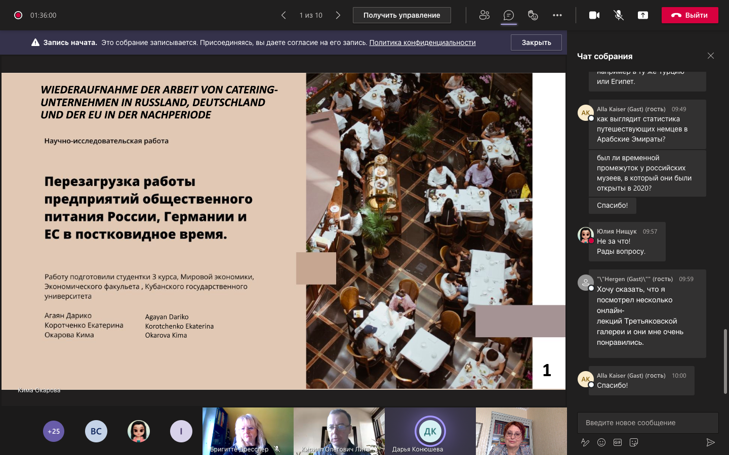 Молодежная российско-германская научно-практическая конференция «Постковидная перезагрузка бизнеса и общества: опыт устойчивого развития России, Германии и ЕС» состоялась 3 мая в дистанционном формате на платформе Microsoft Teams. Это ежегодное научное мероприятие, которое проводится Кубанским государственным университетом и Берлинским университетом прикладных технических и экономических наук (УПТЭН Берлина), начиная с 2002 года, даёт возможность студентам из России и Германии обсудить важнейшие проблемы и вызовы развития современной экономики, бизнеса и права. Участников онлайн-мероприятия приветствовали научные руководители проекта Шевченко Игорь Викторович, д.э.н., профессор, декан экономического факультета КубГУ, и профессор Тило Вендлер, вице-президент по учебной работе и интернационализации УПТЭН. Студенты экономического факультета КубГУ представили в своих докладах результаты проведенных ими исследований по следующим темам: Нищук Юлия, Конограй Полина – «Коронавирусный кризис и культура: трансформация галерей, выставок и музеев»; Конюшева Дарья, Синицина Валерия – «Как изменился туризм в России, Германии, ЕС после пандемии COVID-19»; Коротченко Екатерина, Агаян Дарико, Окарова Кима – «Перезагрузка работы предприятий общественного питания России, Германии и ЕС в постковидное время»; Ниниволин Данил, Зекох Белла – «Государственная поддержка малого и среднего бизнеса в России и Германии на фоне эпидемии COVID-19»; Гупало Павел, Славов Ян – «Кризис немецких предприятий в России в период пандемии».