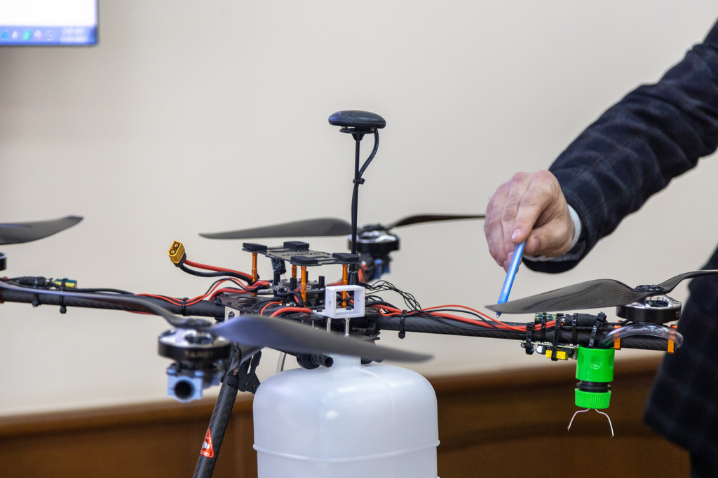 Стартап-проект, автором которого является выпускник экономического факультета Никита Захаров, предполагает использовать агродрон SkyLeenker для внесения средств защиты растений с применением электростатического распыления.