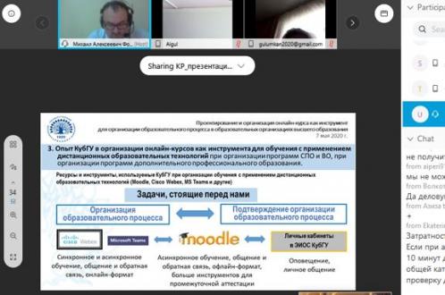 Вебинар на тему «Проектирование и организация онлайн-курса как инструмент для организации образовательного процесса в образовательных организациях высшего образования» состоялся 7 мая 2020 года для преподавателей и сотрудников образовательных организаций высшего и среднего профессионального образования Кыргызской Республики и Республики Узбекистан. Мероприятие организовано по запросу Международного университета Кыргызской Республики и в рамках соглашения о сотрудничестве с Кубанским государственным университетом. В мероприятии приняли участие также представители Нукусского государственного педагогического института им. Ажинияза.
