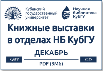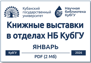 Уважаемые читатели! В данном разделе вы можете ознакомиться с информацией о книжных выставках, которые экспонируются в различных отделах Научной библиотеки КубГУ. Для вашего удобства анонсы книжных выставок даны по месяцам, что позволит вам не пропустить интересные события в жизни библиотеки.