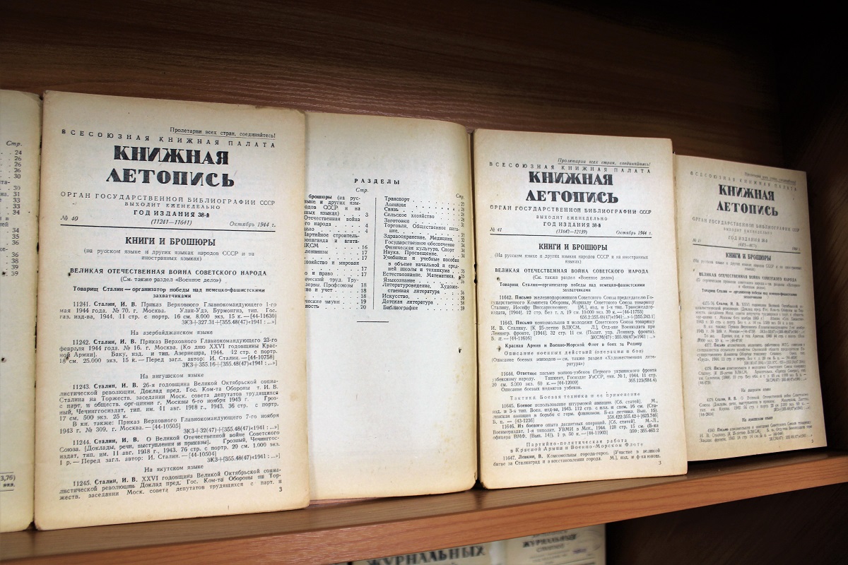 На выставке представлены уникальные печатные издания Всесоюзной книжной палаты: летописи журнальных и газетных статей, книжные летописи, «Ежегодники книги СССР» 1941-1945 гг. издания. В летописи включены библиографические описания книг, брошюр, учебно-методических материалов, официальных документов, статей из журналов и газет, которые были опубликованы в годы Великой Отечественной войны.