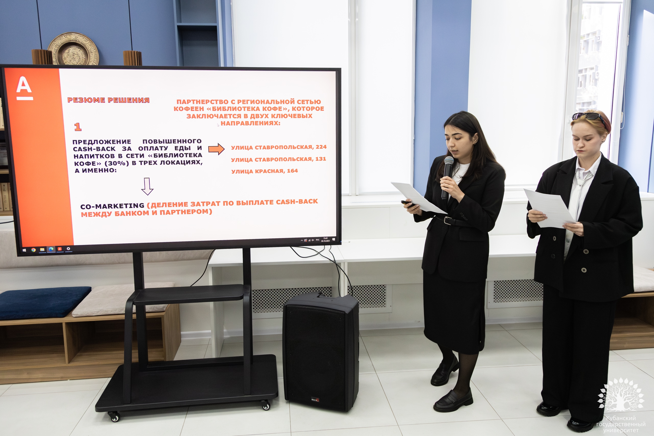 Девушки предложили программу выгодного партнерства банка с сетью краснодарских кофеен, которое заключается в повышенном тарифе cash-back и сниженной тарифной ставке по обслуживанию онлайн-касс.