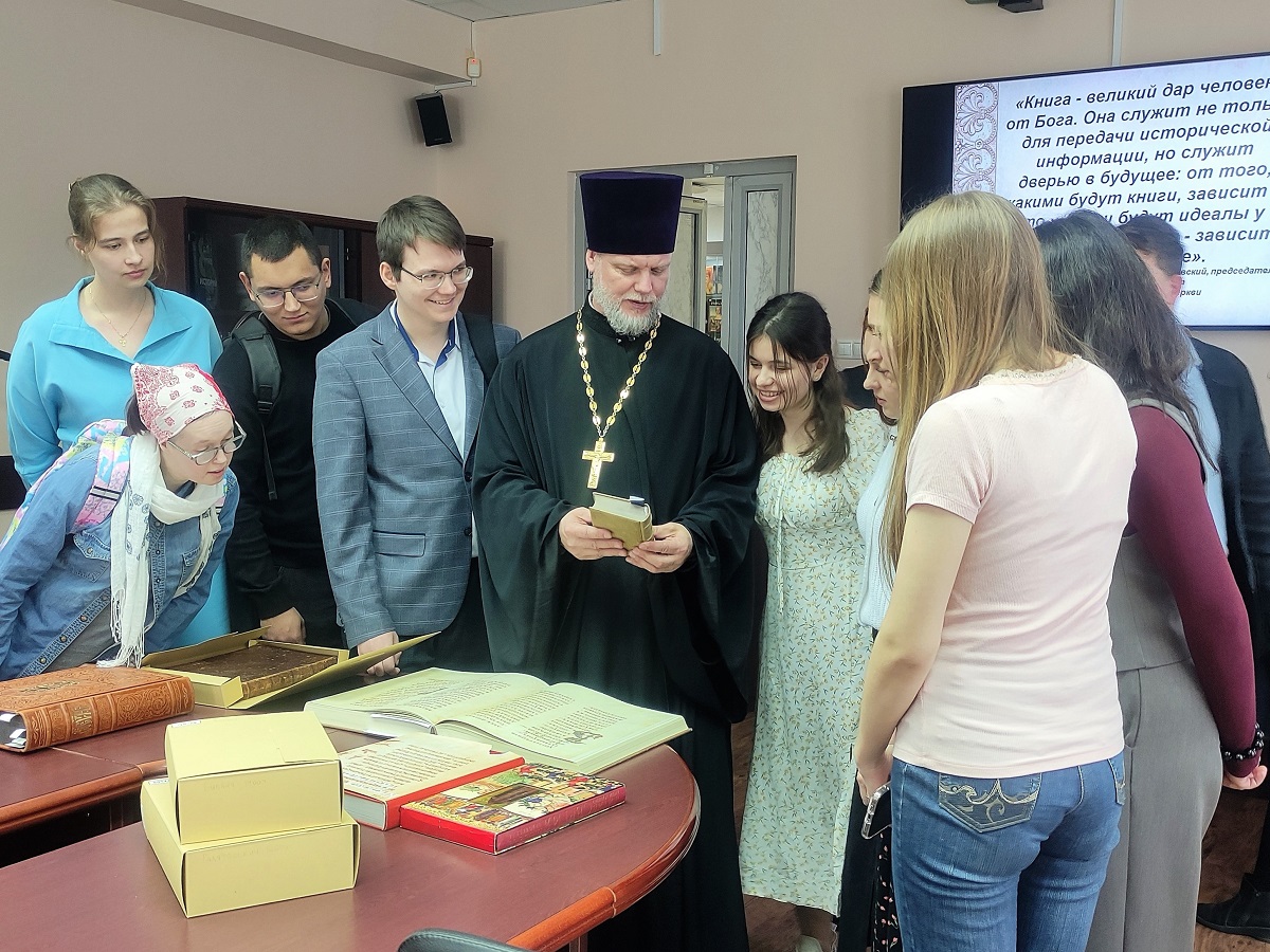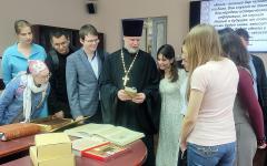 Вниманию гостей были представлены тематический обзор литературы и книжная выставка православной тематики из фонда отдела редких книг. Присутствующие узнали об истории создания рукописных книг, о роли Ивана Федорова и первой типографии, о бесценных изданиях кирилловского шрифта и о современных православных книгах.
