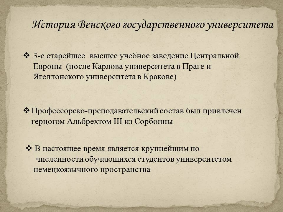 Слайд 4: После Карлова университета в Праге и Ягеллонского университета в Кракове Венский университет является третьим старейшим высшим учебным заведением Центральной Европы, а также старейшим университетом в немецкоязычном пространстве. Для полноценной работы университета герцогу Альбрехту III пришлось переманить из Сорбонны в Вену профессорско-преподавательский состав, а также заручиться поддержкой католической церкви в деле открытия теологического факультета. В итоге в 1385 году было открыто первое университетское здание.
