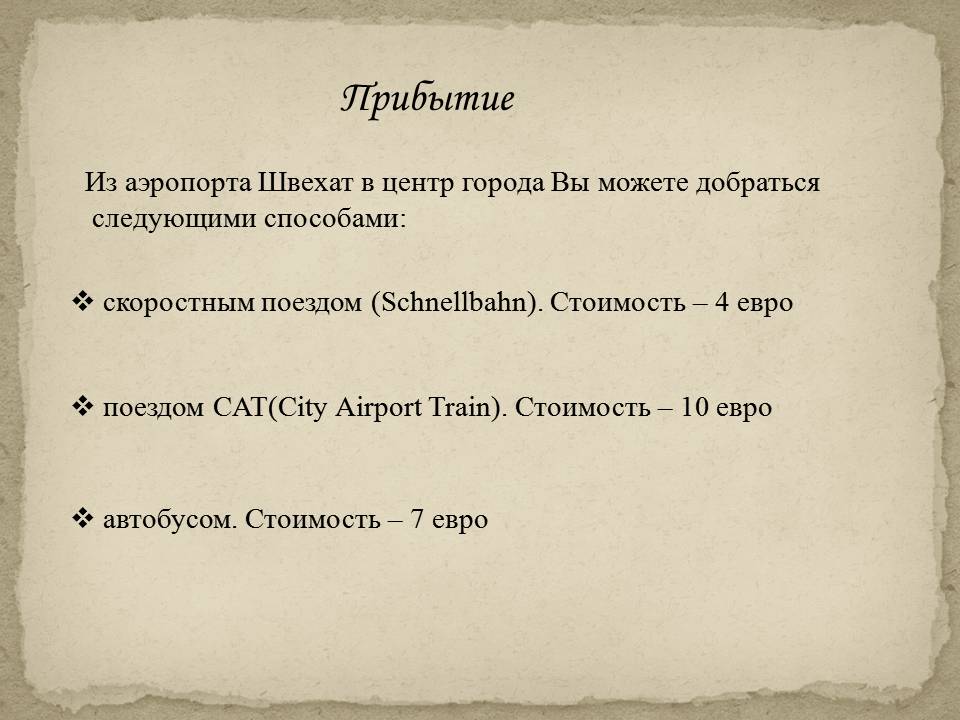 Слайд 6: Перед поездкой убедитесь, что у Вас есть карта метро Вены. Аэропорт Швехат находится в 16 км к востоку от Вены. До центра города можно быстро и удобно добраться общественным транспортом. Между центром города, крупными вокзалами и аэропортом курсируют следующие виды транспорта: