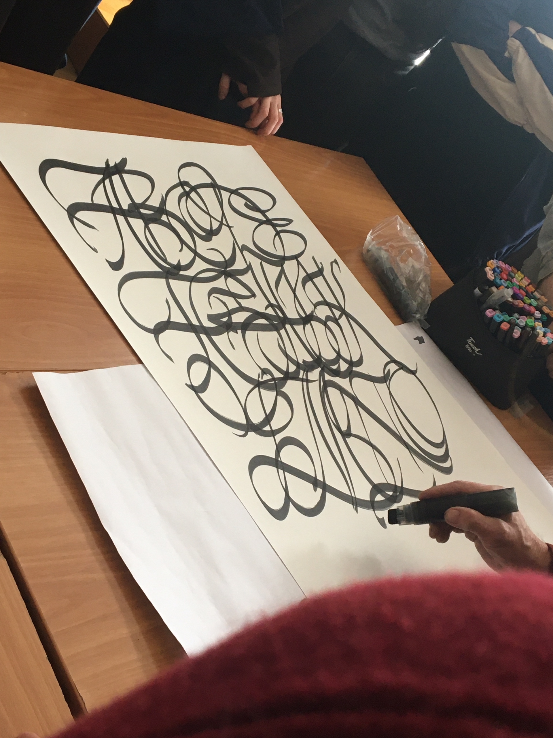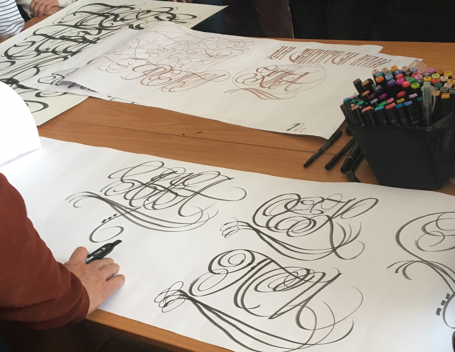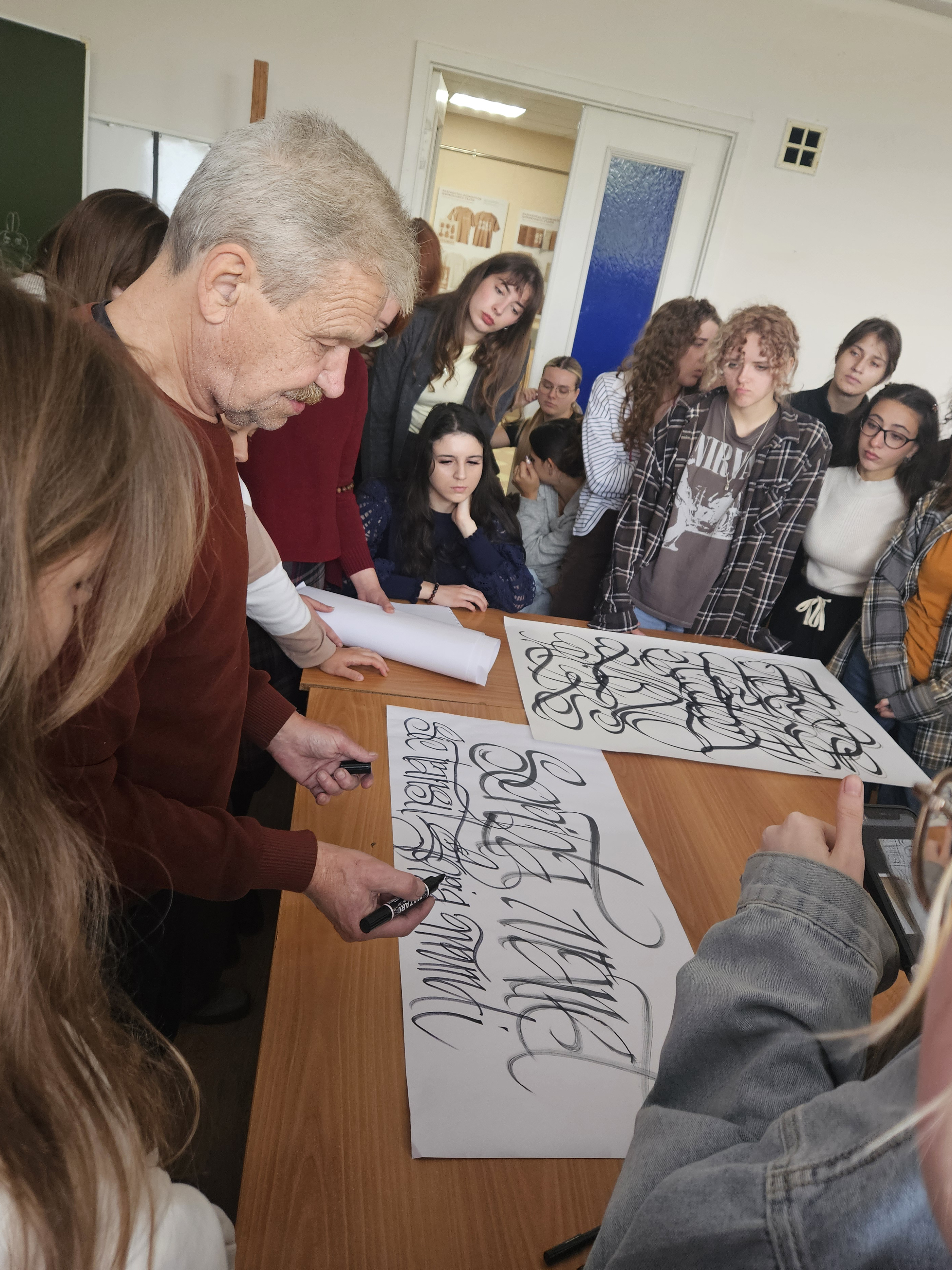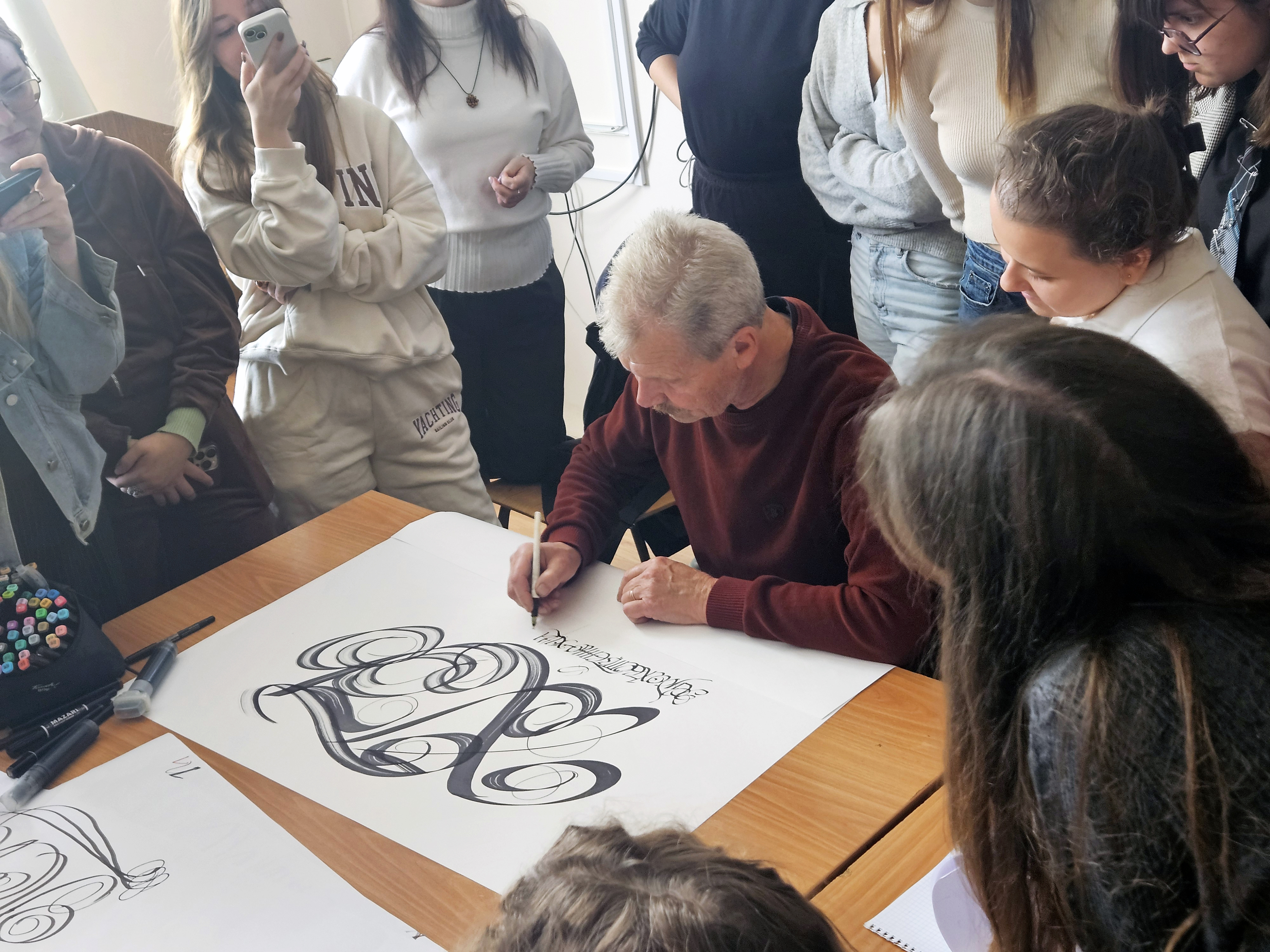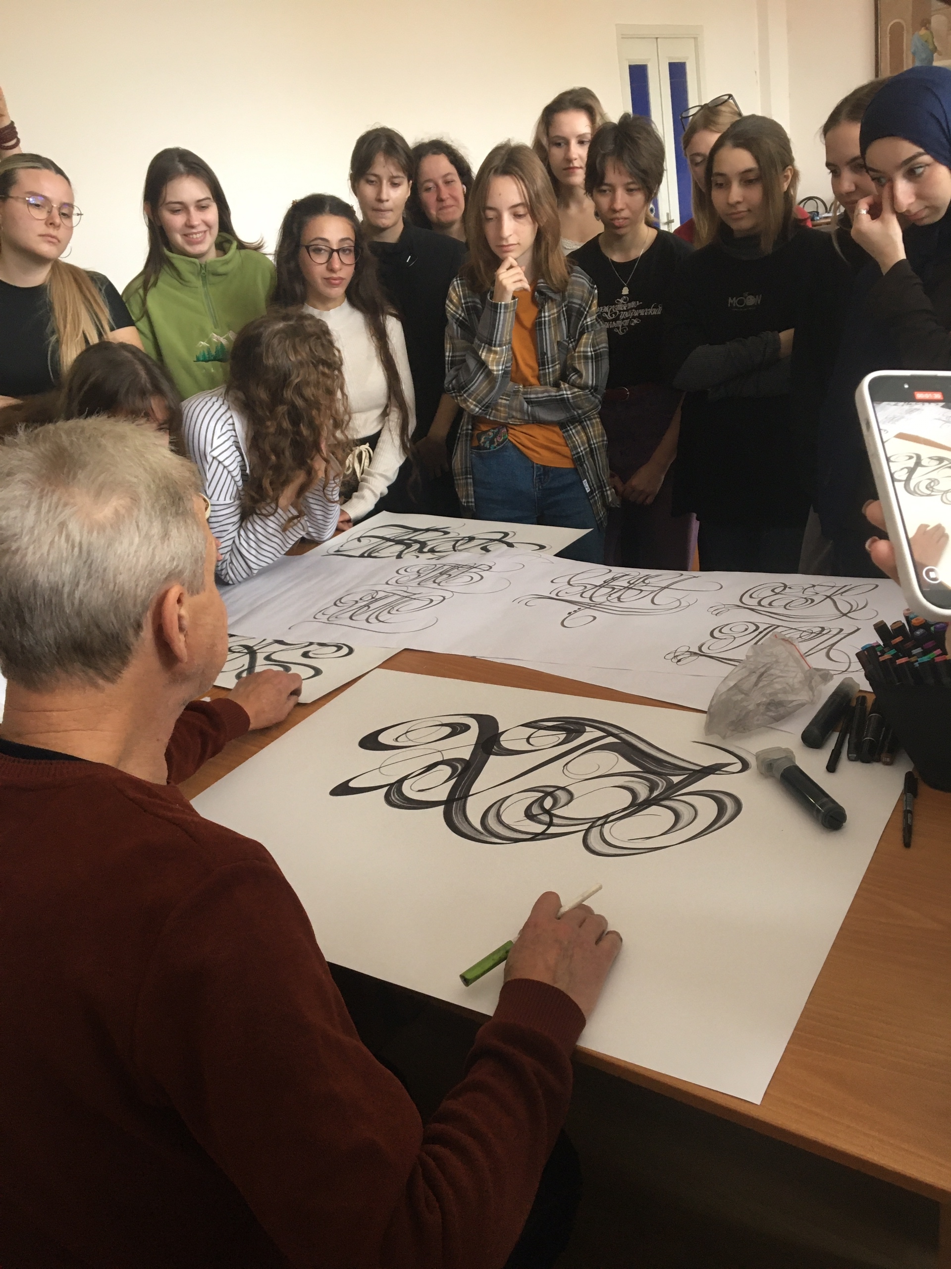 Александр Яковлев на встрече рассказал студентам о каллиграфии, инструментах и принципах создания шрифтовых композиций, а так же о своих творческих работах – как именно создавались полотна. Был проведен мастер-класс по искусству изображения слова: как письму придается эмоционально-образная графическая выразительность.