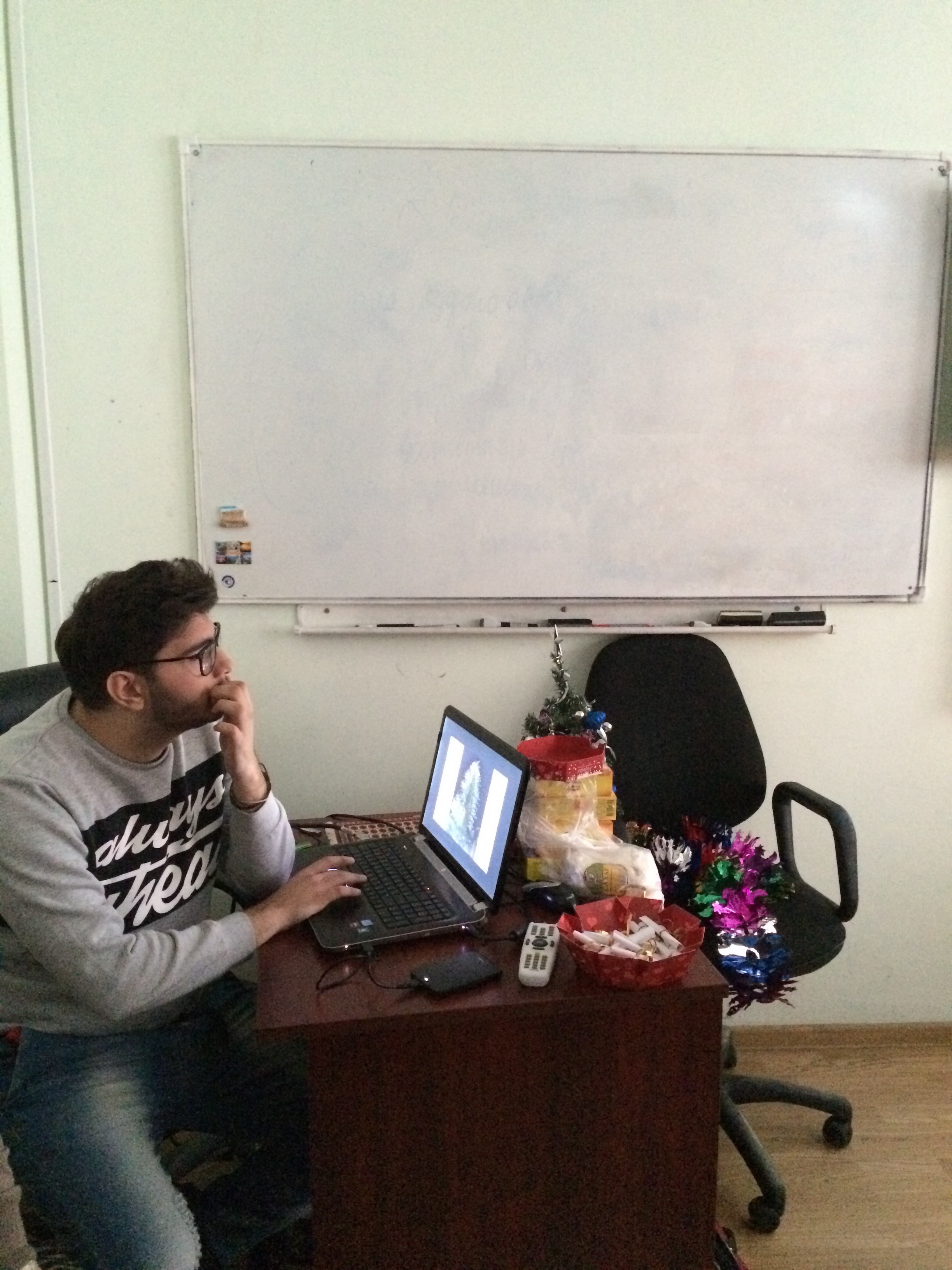 Вместе с преподавателями все они собрались в празднично украшенной аудитории. В центре стоял стол с национальными блюдами, студенты выходили к ёлке, вешали на неё шар с названием своей страны (страны распределились по алфавиту), рассказывали о том, как проходит праздник в их стране, показывали фотографии, объясняли традиции своей страны и выбирали новогодние пожелания, которые были заранее подготовлены. Кому-то досталось пожелание найти друга, кто-то выбрал пожелание поступить учиться дальше, кто-то получил пожелание прочитать самую интересную книгу.