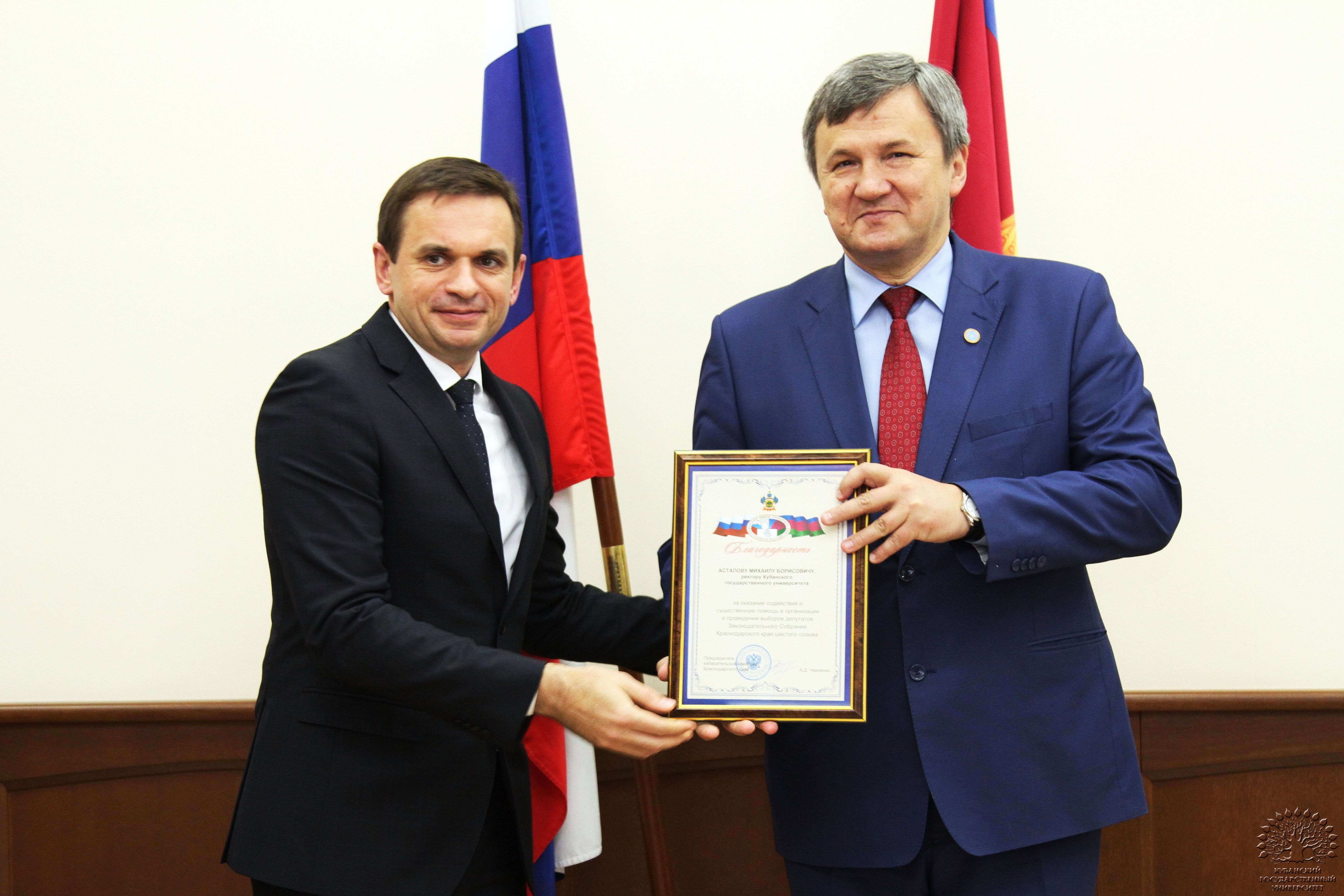 Также благодарность за оказание содействия и существенную помощь в организации и проведении выборов депутатов Законодательного Собрания Краснодарского края шестого созыва председатель избирательной комиссии Краснодарского края вручил ректору КубГУ.