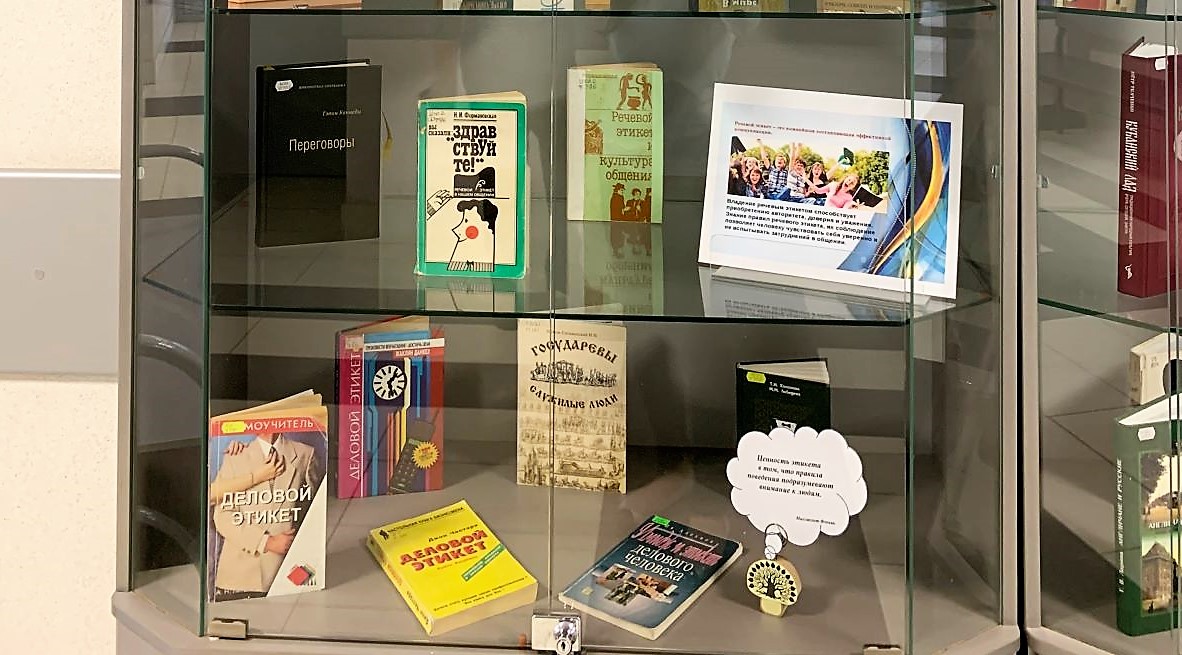 С 14.10.19 по 26.10.19 в холле 3-го этажа библиотечного корпуса развернута тематическая книжная выставка «Этикет. Культура общения».