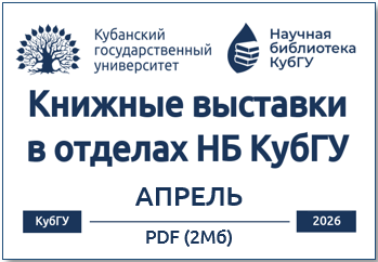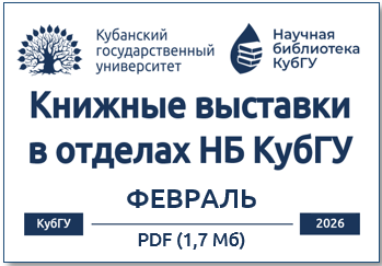 Уважаемые читатели! В данном разделе вы можете ознакомиться с информацией о книжных выставках, которые экспонируются в различных отделах Научной библиотеки КубГУ. Для вашего удобства анонсы книжных выставок даны по месяцам, что позволит вам не пропустить интересные события в жизни библиотеки.