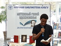 14 октября, в рамках X Международной акции «День лермонтовской поэзии в библиотеке» и к Дню рождения поэта, в центральном холле КубГУ Научная библиотека провела поэтический флешмоб «Перечитывая Лермонтова…». Любимые стихи великого поэта читали студенты: С. Клопотная, Е. Чаленко, А. Минко, Д. Гез, Н. Карабут (филологический факультет); А. Агабабян, Д. Зимина (юридический факультет); Д. Сусь, А. Кравов, В. Жуковская (ФМиКН); В. Кравченко, Л. Конева, Д. Пыльская (факультета управления и психологии); Н. Климов (ИГГТиС); М. Шепилова (ФППК); Я. Жукова (факультет журналистики). Участниками флешмоба стали также иностранные студенты, изучающие русский язык на подготовительном отделении КубГУ: Тамир Болор-Эрдэнэ (Монголия), Нашашиби Дауд (Израиль), Силла Дауда (Кот-д'Ивуар), Дабо Леллу Данхоби Гертруде Хлое (Кот-д'Ивуар), Хайдар Сулейман (Сирия), Альнавад Саад (Саудовская Аравия). Поэтическая акция дала возможность всем присутствующим в очередной раз погрузиться в прекрасный и трогательный мир поэзии М.Ю. Лермонтова, подарила отличное настроение и заряд положительных эмоций.