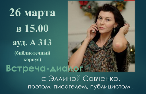 26 марта в Научной библиотеке КубГУ состоялась творческая встреча с членом Международного Союза писателей и мастеров искусств, руководителем Совета молодых литераторов Кубани при Союзе писателей России, поэтом и прозаиком Эллиной Савченко.