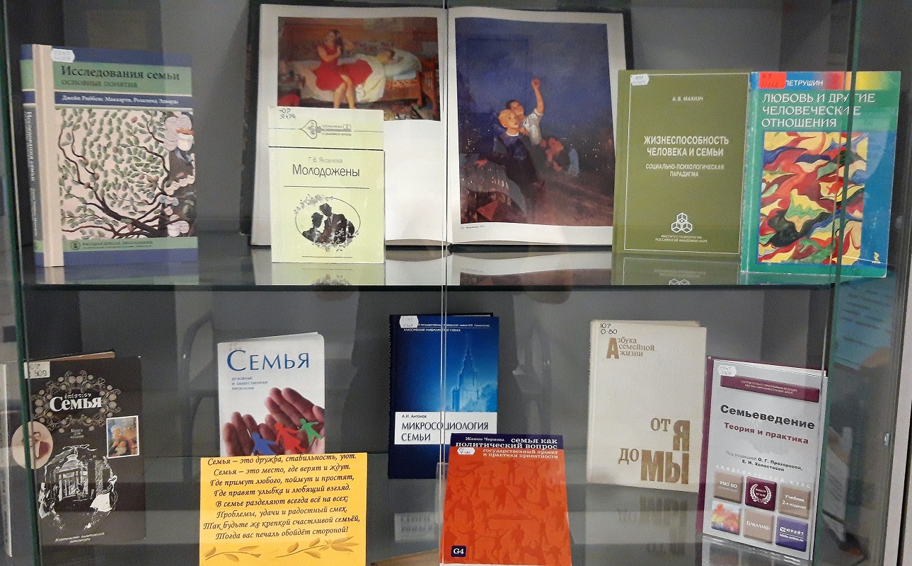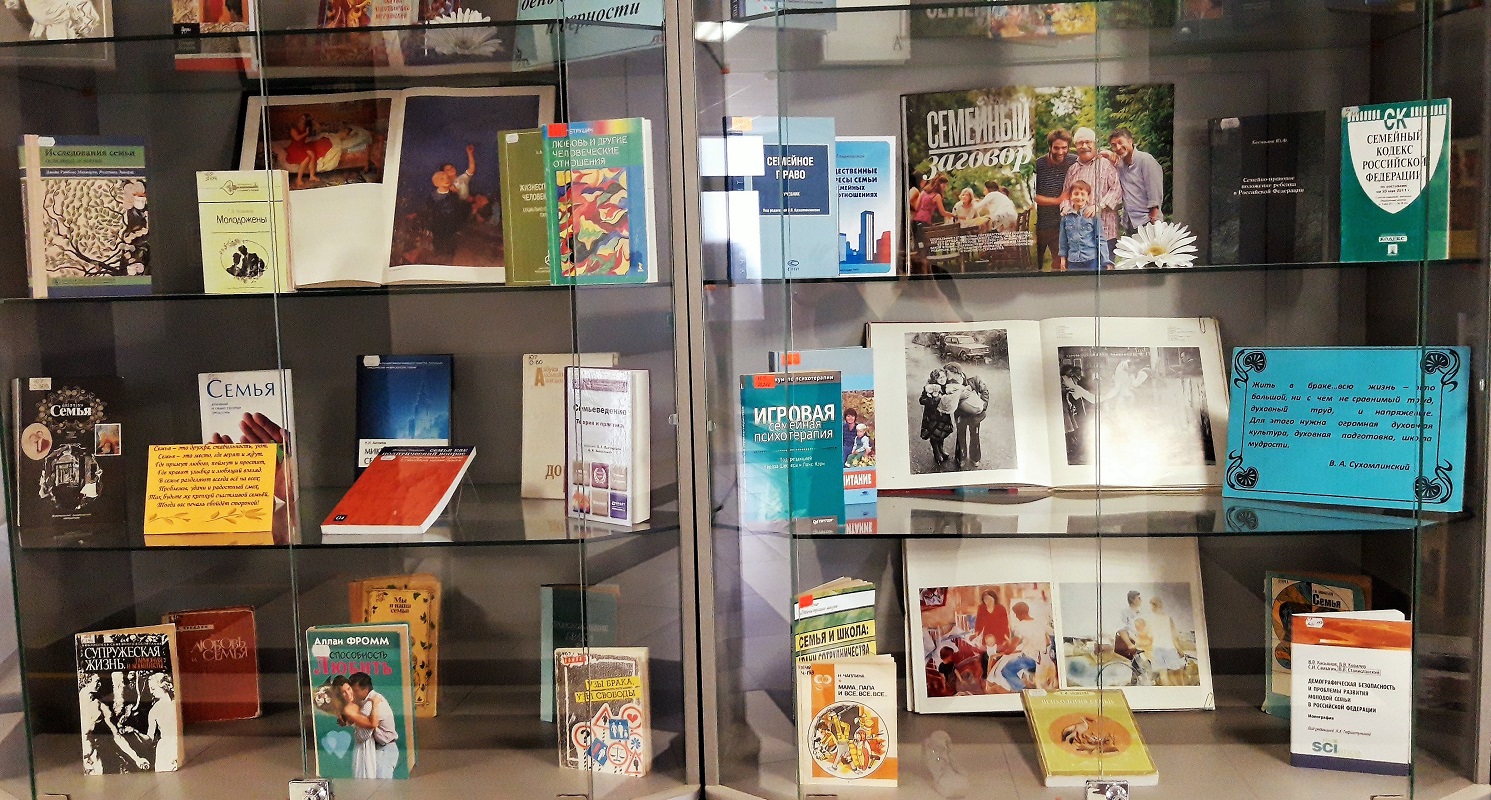 На выставке представлены художественные альбомы, научная и художественная литература о роли семьи в современном обществе, о принципах построения семейного счастья.