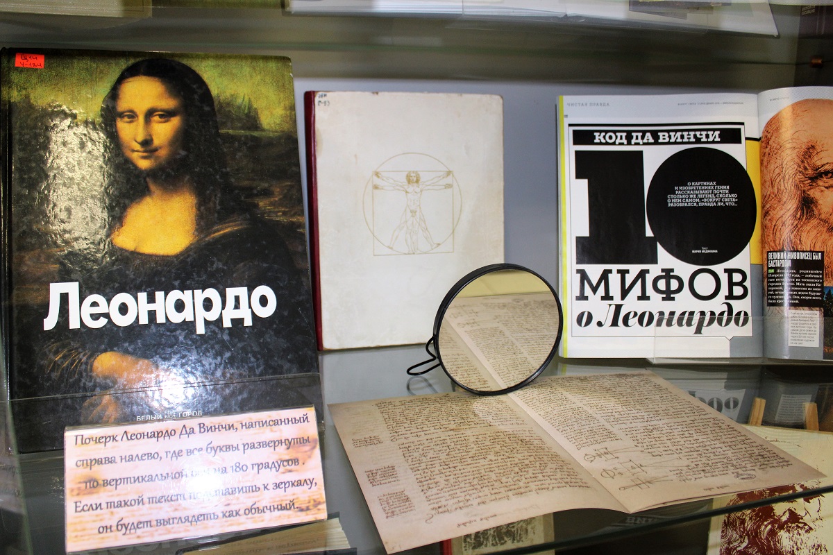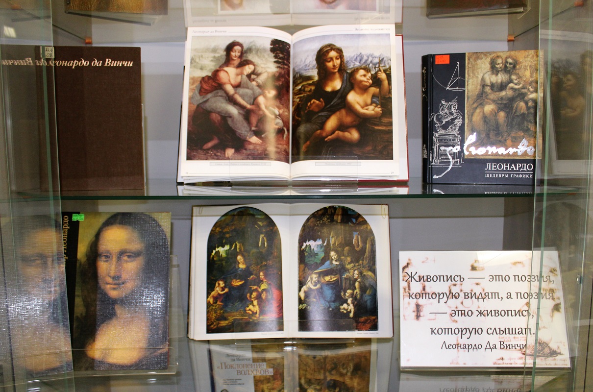 Имя Леонардо да Винчи еще при жизни было окружено легендами и мифами. Представленная на выставке литература, поможет читателям приблизиться к разгадке тайн великого Леонардо. Вы познакомитесь с изданиями, посвященными биографии и творческому пути художника, расследованиям загадок его легендарных картин, а также увидите прекрасно иллюстрированные художественные альбомы, рисунки, чертежи, схемы летательных аппаратов, архитектурные разработки Леонардо, анатомические исследования, литературные произведения. На выставке представлены факсимильные документы - фрагменты заметок и эскизов Леонардо по статике, динамике, пропорциям и многое другое.