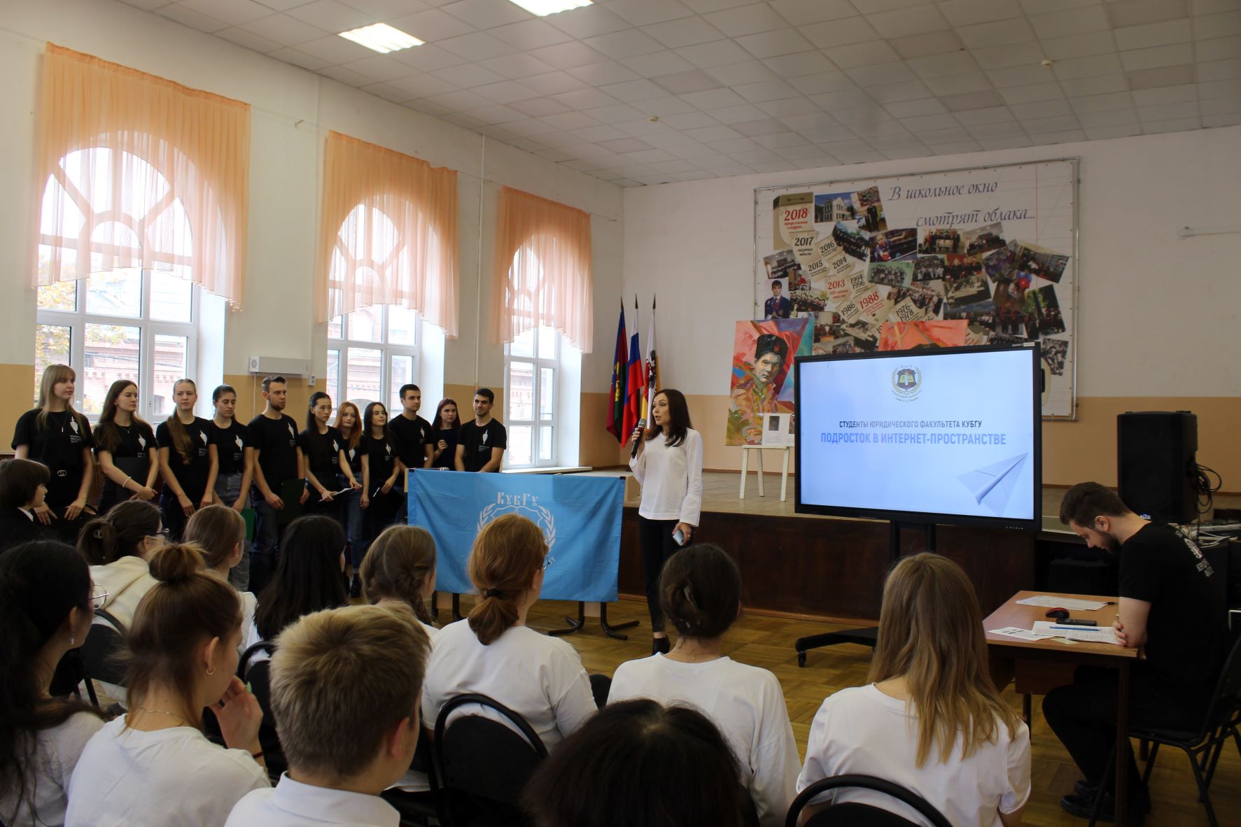 В рамках взаимодействия КубГУ с общеобразовательными организациями Краснодара, приобщения школьников к проектной деятельности и их профессиональной ориентации 26 октября в средней школе № 8 имени Героя Советского Союза партизана Геннадия Игнатова студенты 5 курса юридического факультета им. А.А.Хмырова презентовали социально-просветительский правовой проект «Студенты – школьникам «Подросток в интернет-пространстве». Он реализуется по инициативе и под руководством члена Общественной палаты города Краснодара, кандидата юридических наук, доцента кафедры конституционного и административного права Марины Михайловны Курячей.