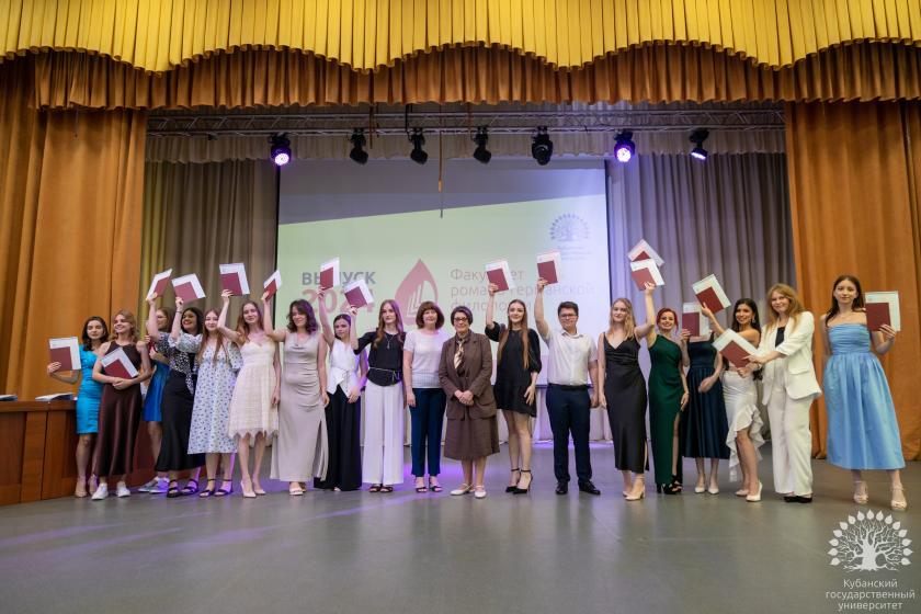 10 июля на факультете романо-германской филологии состоялась торжественная церемония вручения дипломов по направлениям подготовки бакалавриата, магистратуры и специалитета. В этом году 327 выпускников факультета начнут свой трудовой путь как педагоги, переводчики и специалисты в сфере языка и межкультурной коммуникации. На праздничном концерте студентов поздравили проректор по цифровому развитию Елена Валерьевна Строганова, декан факультета РГФ Наталья Борисовна Шершнева, а также коллектив преподавателей. Представители университета пожелали успехов и профессиональных высот своим воспитанникам, несущим гордое звание студентов Кубанского государственного университета.