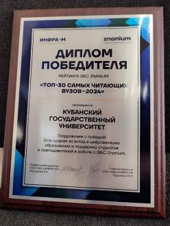 КубГУ занял третье место среди классических университетов в рейтинге «ТОП-30 самых читающих вузов России» по активности использования ЭБС «Znanium» в образовательной и научно-исследовательской деятельности вуза.