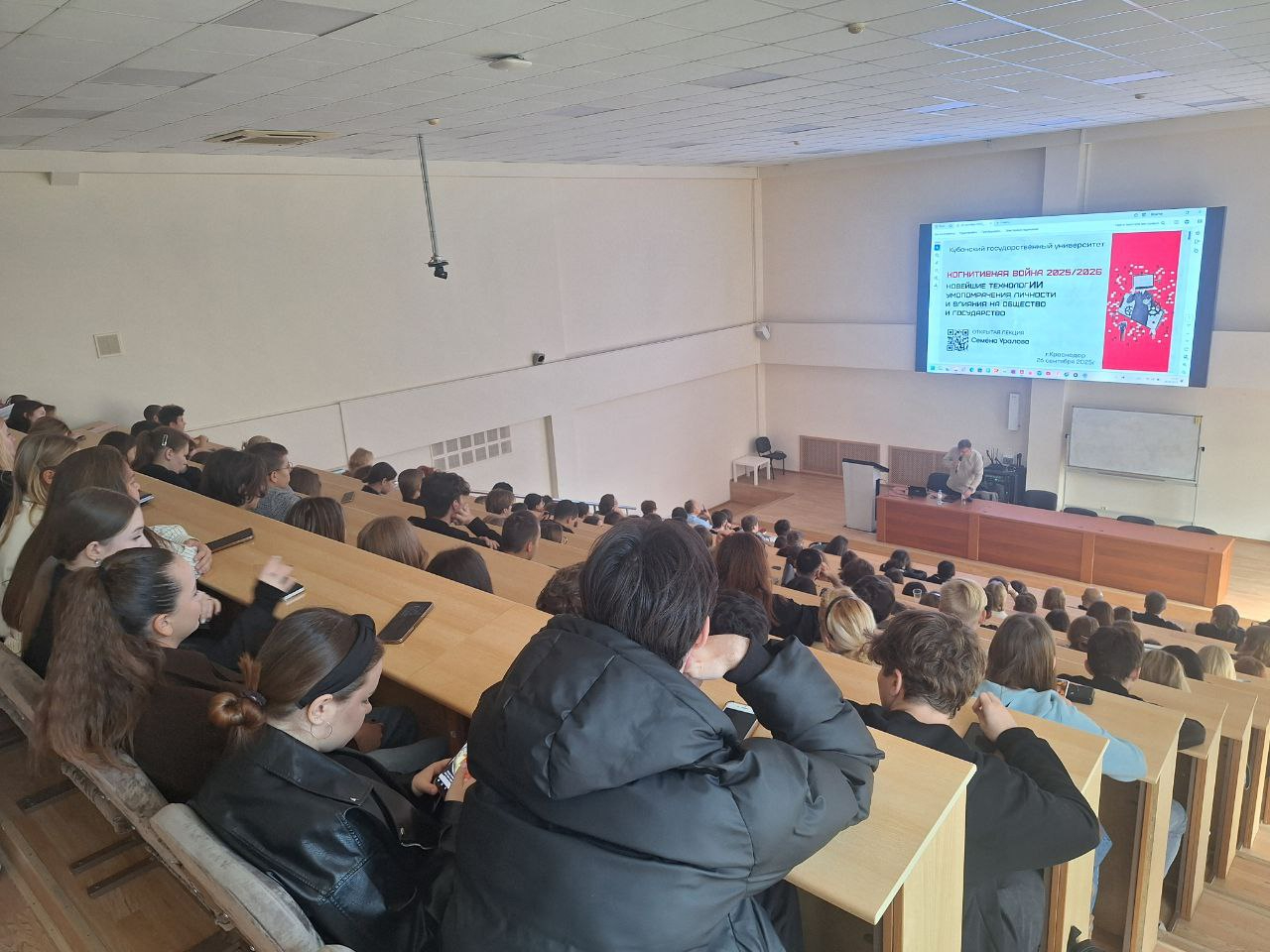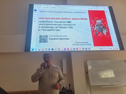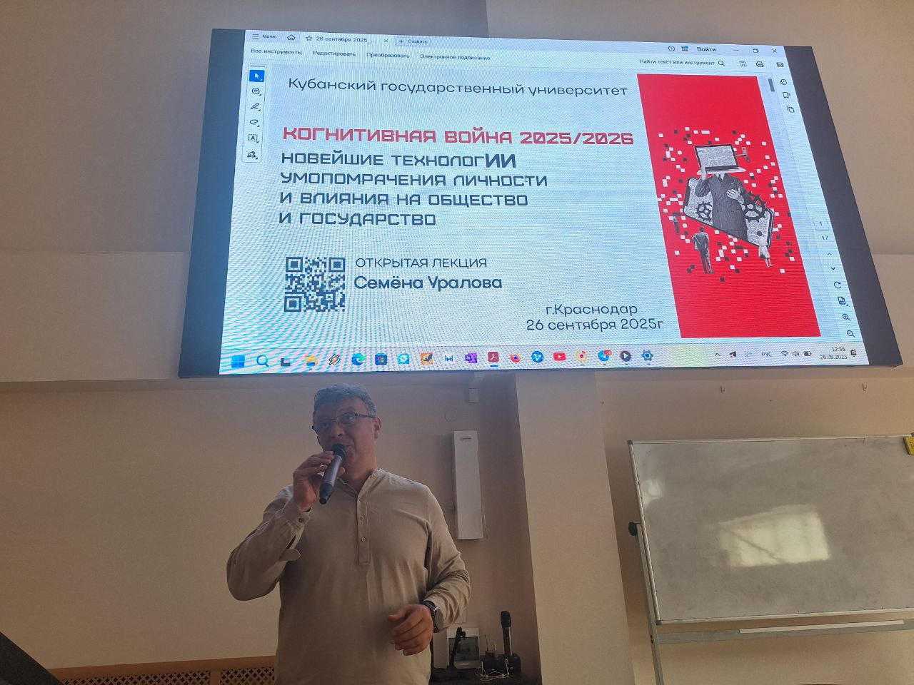 Известный российский политический технолог, медиатехнолог, журналист, писатель и блогер Семен Сергеевич Уралов вновь посетил Кубанский государственный университет. Темой лекции, прошедшей в формате «Открытого диалога», стала «Когнитивная война 2025-2026: новейшие технологИИ умопомрачения личности и влияния на общество и государство». Эксперт рассказал собравшимся о том, что ведение войн в сознании человека – это не плоды фантазий писателей-фантастов или выдержки из фолиантов про теории заговора, а вполне конкретные технологии социальной инженерии, являющиеся полностью управляемым процессом.