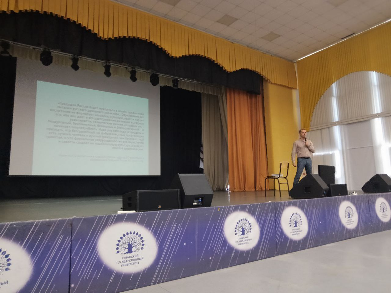 В нашем университете прошло масштабное мероприятие – обучающий семинар для всех кураторов академических групп первого курса. Открыл мероприятие выступлением по вопросу актуальности воспитательного аспекта в образовательной деятельности проректор по воспитательной работе и социальным вопросам КубГУ Николай Васильевич Редькин. Затем слово взял проректор по учебной работе, качеству образования – первый проректор Темыр Айтечевич Хагуров, презентовавший слушателям актуальную аналитику социокультурных процессов современного российского общества.