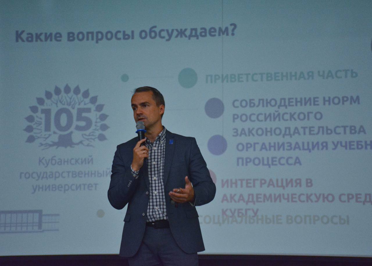 С приветственным словом выступил проректор по воспитательной работе и социальным вопросам КубГУ Николай Редькин. Он поздравил первокурсников с началом учебы в КубГУ, одном из крупнейших вузов юга России, отметившем в сентябре свое 105-летие, обратил внимание на достижения университета в области науки и образования и инновационные подходы к обеспечению качества образования и дальнейшего научно-технологического развития, а также подчеркнул особое внимание вуза к созданию условий для здорового образа жизни обучающихся и их личностного развития.