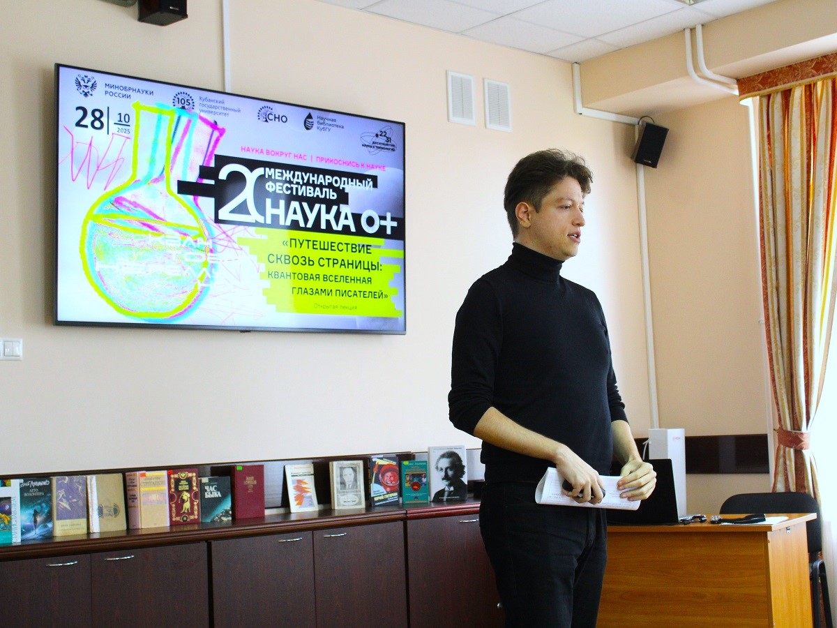 28 октября Научная библиотека КубГУ в рамках всероссийского фестиваля «Наука 0+» провела открытую лекцию «Путешествие сквозь страницы: квантовая Вселенная глазами писателей», посвященную удивительным пересечениям квантовой физики и художественной литературы.