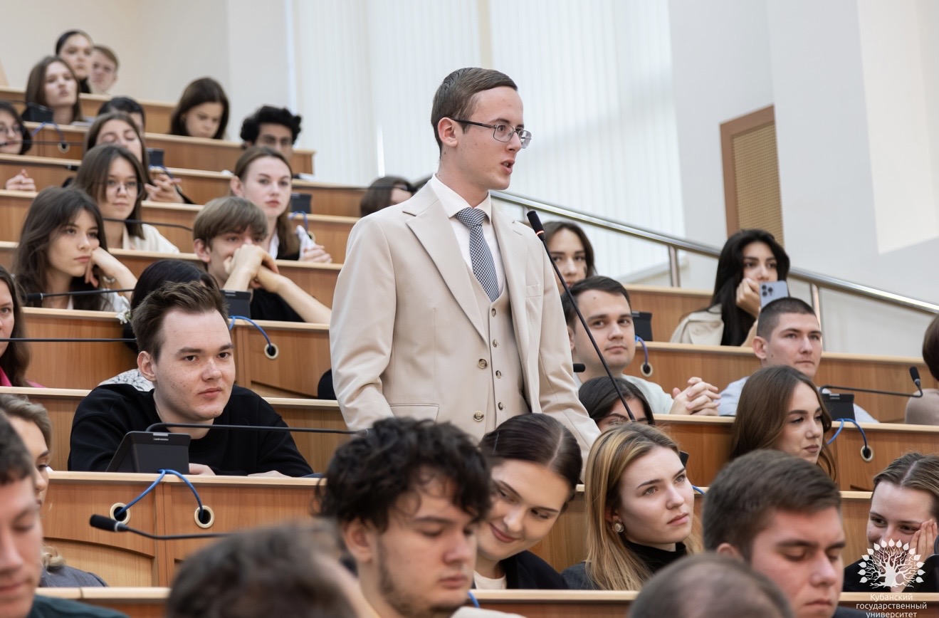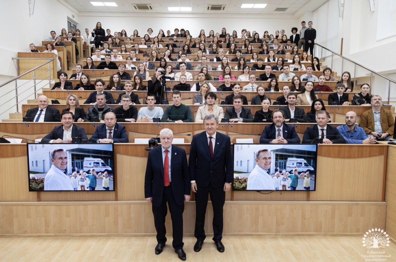 Посещение Кубанского госуниверситета завершилось встречей со студентами университета. Но началась она очень неординарно: Сергей Михайлович спел студентам фрагмент песни и попросил угадать кинофильм – «Добровольцы». Узнали! Далее обсуждали науку, общество и будущее страны. Завершили общей фотографией на память.