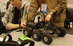 — Да, почему так происходит? Потому что на соревнованиях достаточно сложная трасса, поэтому падения постоянные, причём не только на самом этапе, но и при тестировании, при отработке. Следовательно, каждая деталь должна быть, как минимум, в нескольких экземплярах. У нас тут микроконтроллер отдельный, ноутбуков тоже, как вы видите, не один. Роутер, кстати, всего один и если он сломается — никуда не поедем.