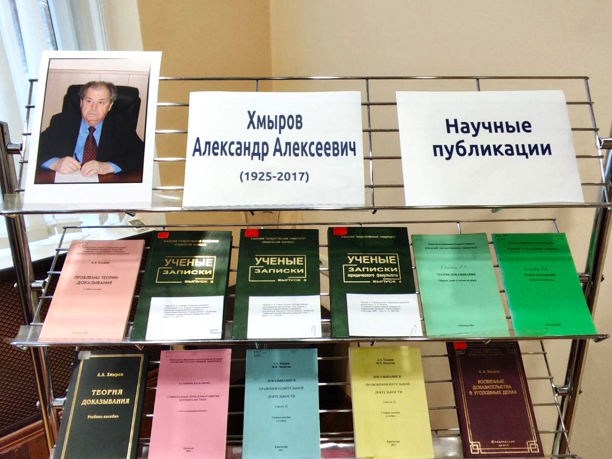 Книжная выставка «Хмыров Александр Алексеевич (1925 - 2017). Научные публикации» была развернута в музее истории КубГУ. На выставке были представлены научные труды А.А. Хмырова, внесшего, за годы своего академического пути, значительный вклад в развитие юридической науки и высшего образования Краснодарского края. Авторитетный ученый-криминалист, заслуженный юрист России, доктор юридических наук, заслуженный профессор КубГУ, А.А. Хмыров написал более сотни научных статей, монографий и учебно-методических материалов.