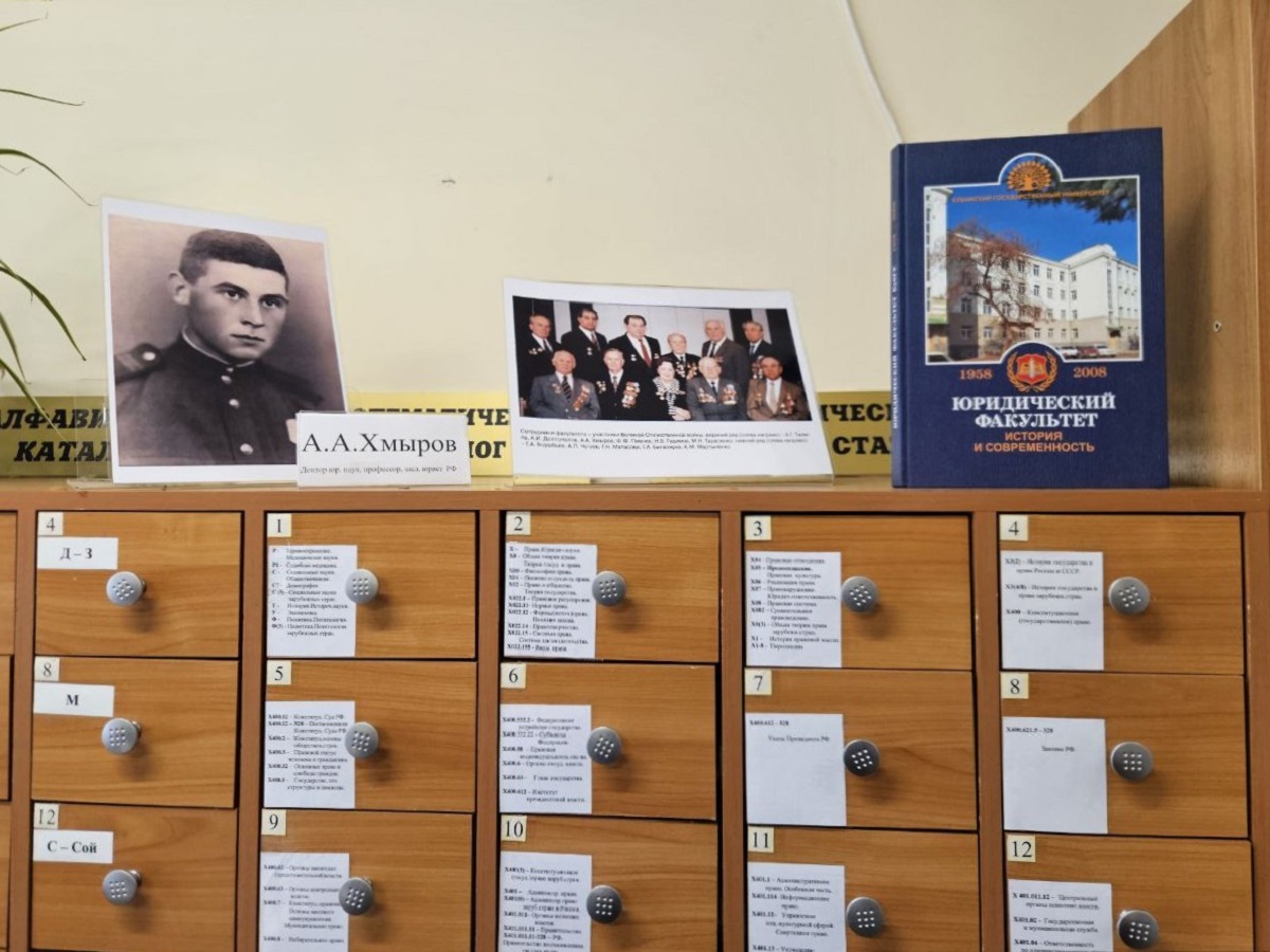 С 8 по 12 декабря Научная библиотека организовала книжные выставки, посвященные 100-летию со дня рождения известного ученого, участника Великой Отечественной войны, первого декана юридического факультета КубГУ Александра Алексеевича Хмырова.