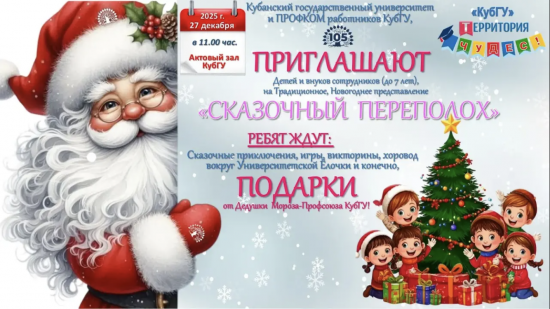 Поздравляем с Новым Годом и Рождеством! Желаем Вам счастья и здоровья в Новом Году! Приглашаем ваших детей и внуков на Новогоднюю Ёлку 27 декабря, в 11.00, в Актовый зал КубГУ! Детей ждут сказочное представление и подарки! С Новым Годом, с новым счастьем!