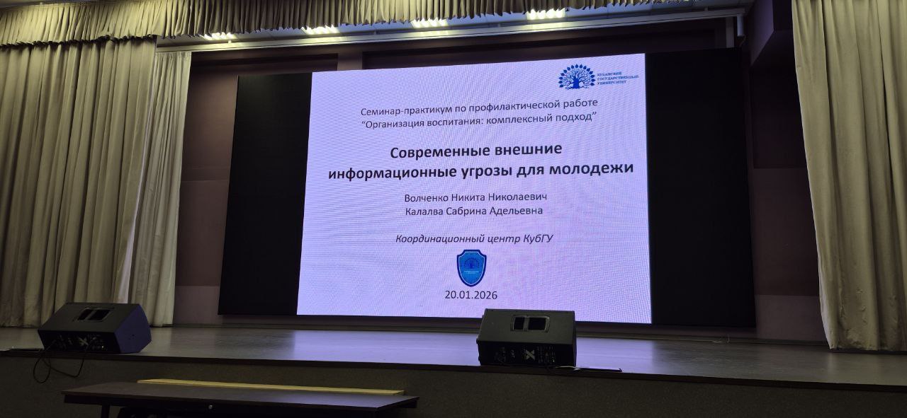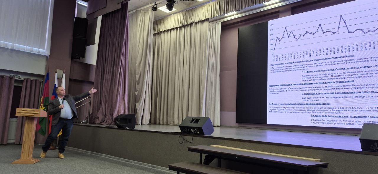 Краснодарским научно-методическим центром, как ключевой городской структурой по методической и аналитической поддержке педагогов города 20 января был организован семинар-практикум “Организация воспитания – комплексный подход”. Участниками которого стали заместители директоров по воспитательной работе, классные руководители, педагоги-психологи, социальные педагоги и другие ответственные сотрудники всех школ Краснодара. Организатором мероприятия выступил начальник отдела анализа и поддержки воспитательного процесса КНМЦ Евгений Корчагин, обрисовавший собравшимся картину современных актуальных проблем в этой профессиональной области. В качестве ключевых приглашенных спикеров на семинаре выступили Лев Крутов (эксперт Лиги безопасного интернета, член Общественной палаты Краснодарского края) и специалисты КубГУ – старший инспектор КЦ Никита Волченко и студентка ФИСМО, лидер студенческой информационно-аналитической группы университета Сабрина Калалва. Представители КубГУ в рамках своего доклада «Современные внешние информационные угрозы для молодежи» ознакомили специалистов школ с некоторыми собранными в университете материалами и выводами по их анализу. В качестве важных тезисов было отмечено, что в настоящее время в сетевом пространстве против российских школьников и педагогического сообщества фактически идёт многоуровневая информационно-психологическая война широкого профиля. От попыток базовых когнитивных искажений картины мира через исторические фальсификации, вербальные манипуляции. До прямой вербовки в качестве одноразовых диверсантов для соучастия в терактах. Специалисты КубГУ сделали отдельный акцент на нефинансовых методах склонения к деструктивным действиям, в частности – технологиям геймификации.