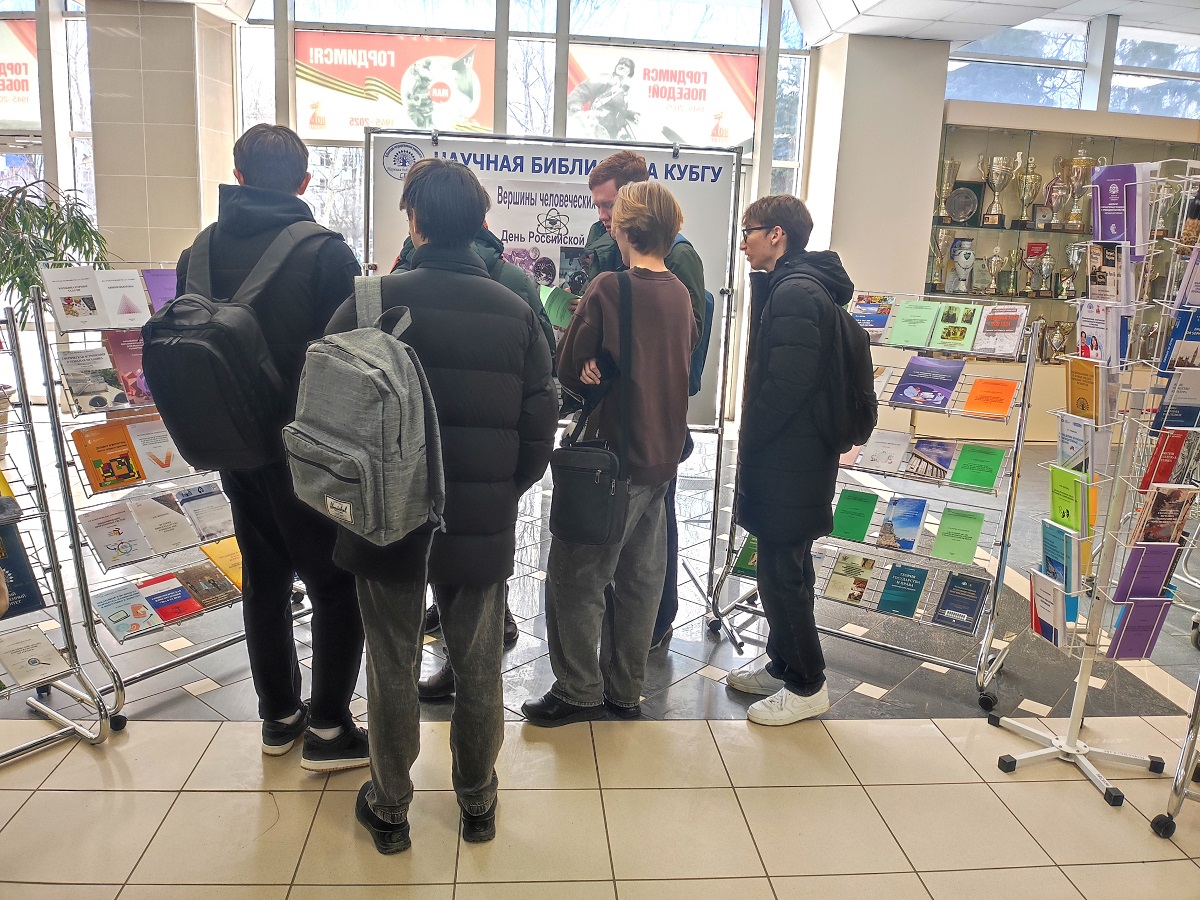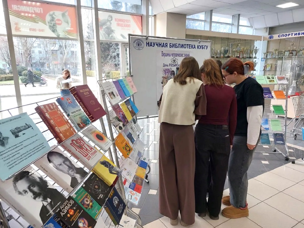 6 февраля Научная библиотека КубГУ провела в центральном холле книжную выставку-просмотр «Вершины человеческих знаний», посвященную Дню российской науки, который отмечается ежегодно 8 февраля.