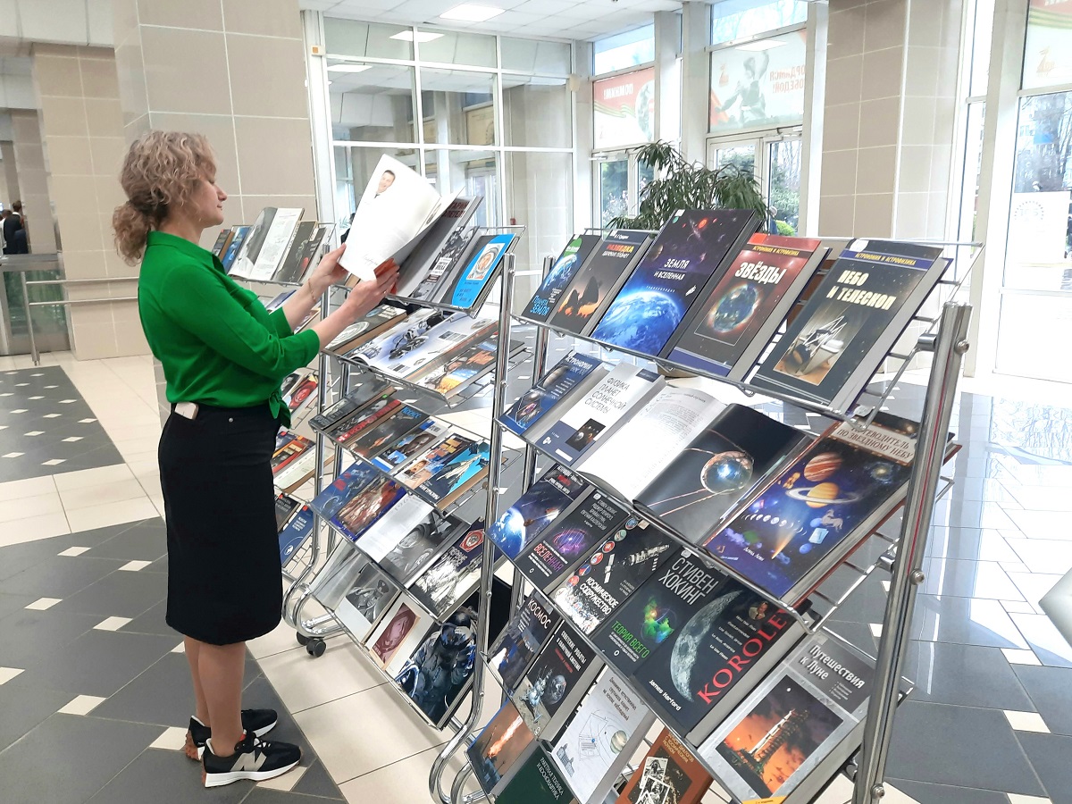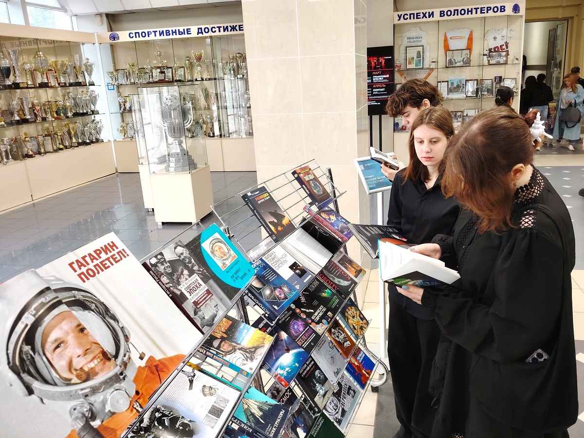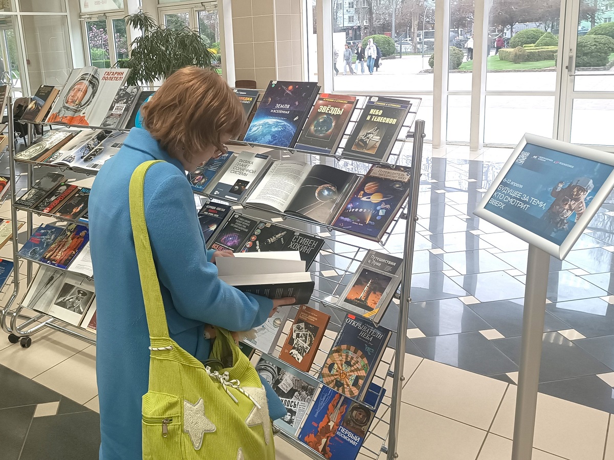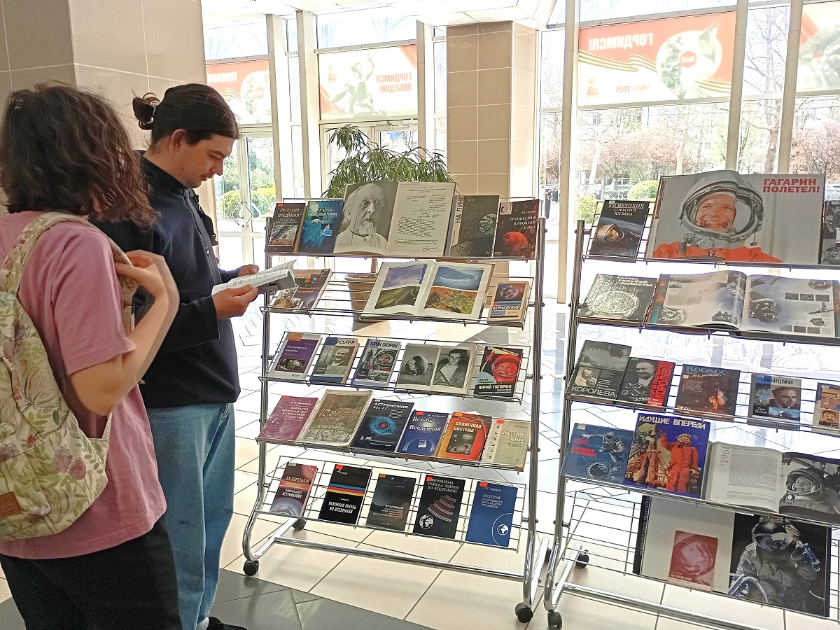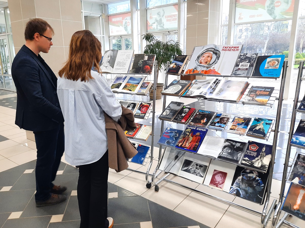 7 апреля научная библиотека КубГУ провела в центральном холле книжную выставку «Будущее за теми, кто смотрит вверх!», посвященную Всемирному дню авиации и космонавтики и 65-летию первого полета человека в космос.