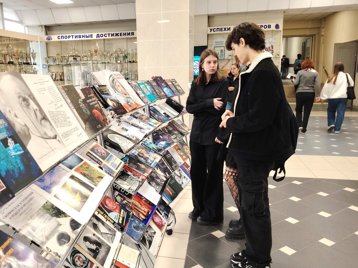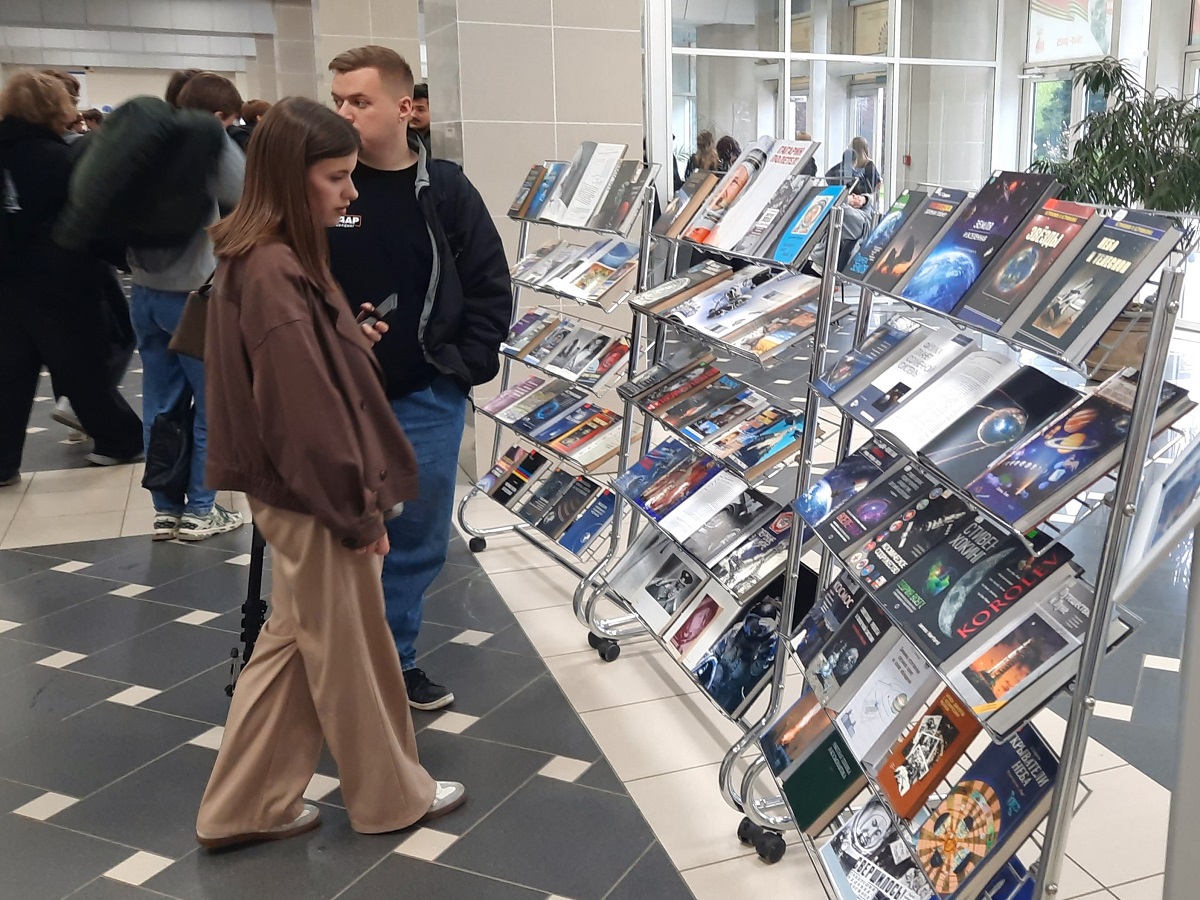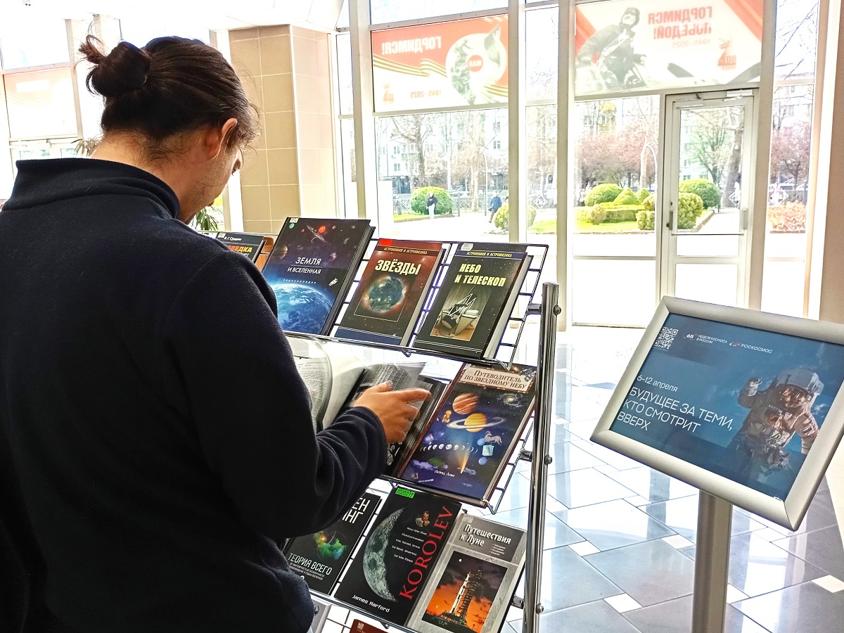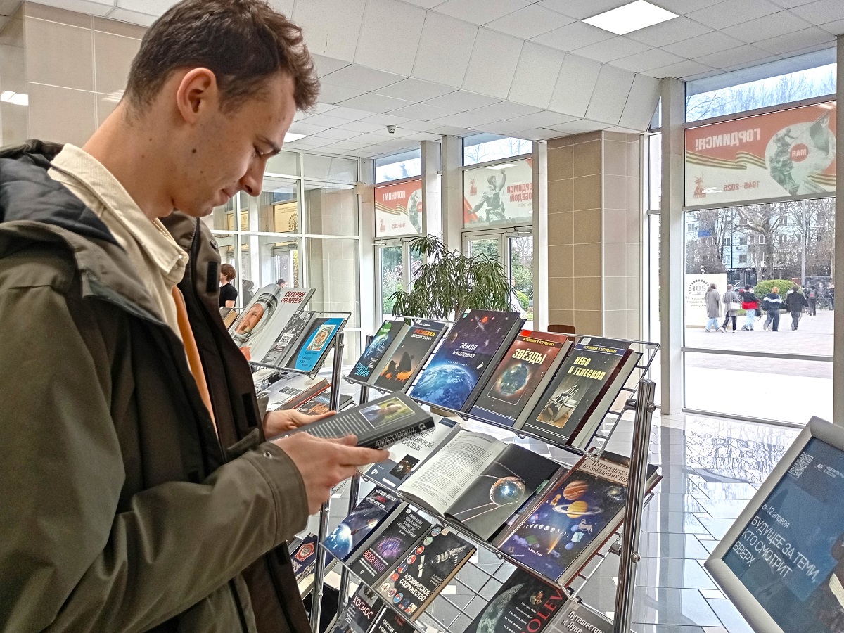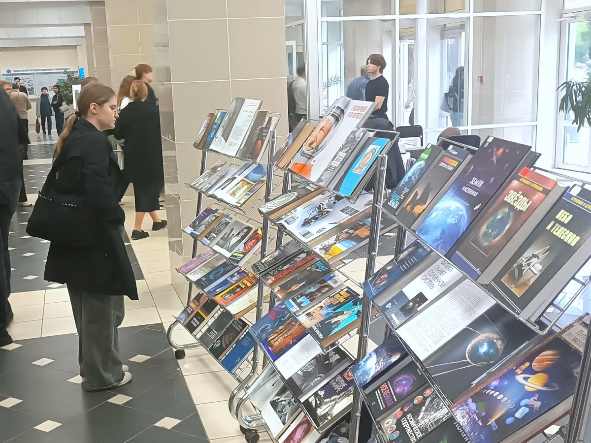 7 апреля научная библиотека КубГУ провела в центральном холле книжную выставку «Будущее за теми, кто смотрит вверх!», посвященную Всемирному дню авиации и космонавтики и 65-летию первого полета человека в космос.