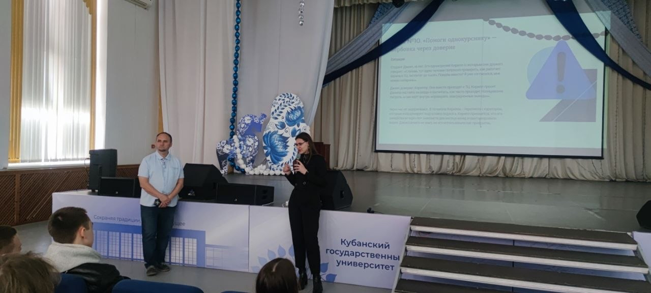8 апреля специалист Координационного центра КубГУ Никита Николаевич Волченко и лидер студенческой информационно-аналитической группы Сабрина Калалва встретились со студентами Института среднего профессионального образования (ИНСПО) КубГУ. Мероприятие было посвящено актуальным вопросам кибербезопасности и профилактике вовлечения молодежи в противоправную деятельность.