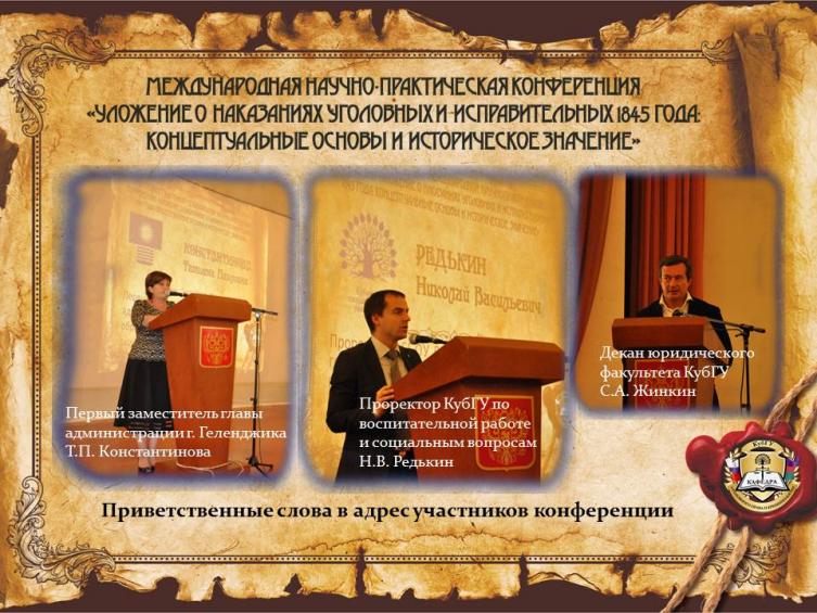 2-3 октября 2015 г. под эгидой председателя Программного комитета – ректора Кубанского государственного университета М.Б. Астапова кафедрой уголовного права и криминологии на базе филиала названного учебного заведения в г. Геленджике была организована и проведена международная научно-практическая конференция «Уложение о наказаниях уголовных и исправительных 1845 года: концептуальные основы и историческое значение (к 170-летию со дня принятия)». В качестве председателя Оргкомитета непосредственное руководство работой данной конференции осуществлял заведующий указанной кафедры, вице-президент Российского конгресса уголовного права, заслуженный юрист РФ, доктор юридических наук, профессор В.П. Коняхин при активном участии заместителя председателя Оргкомитета – директора филиала Кубанского государственного университета в г. Геленджике, заслуженного учителя РФ Р.С. Масловой и члена Оргкомитета – координатора конференции, доцента кафедры уголовного права и криминологии, кандидата юридических наук В.Н. Куфлевой.